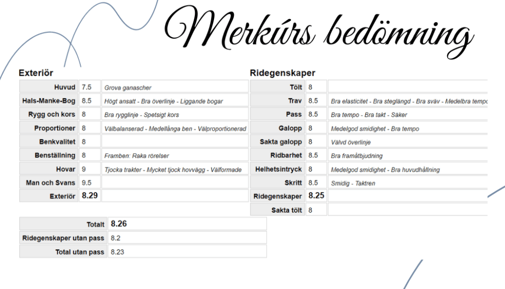 Sveriges högst bedömda 6-åriga hingst 2023 med en totalbedömning på 8,26 med 8,29 för exteriör och 8,25 för ridegenskaper. Han tog brons på VM i Holland och SM guld i avelsklassen 2023.